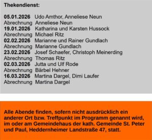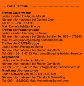 | Weitere Veranstaltungen sind im Jahresprogramm 2026 des Diözesanverband Limburg oder unter zu finden. Anmeldung(en) an folgende Adresse: Kolpingwerk Diözesanverband Limburg Lange Straße 26, 60311 Frankfurt Tel.: 069-29906 -801, Fax: 069/29906 -810 info@kolpingwerk-limburg.de Schreiben Sie uns ihre Meinung unter: info@kolping-heddernheim.de |